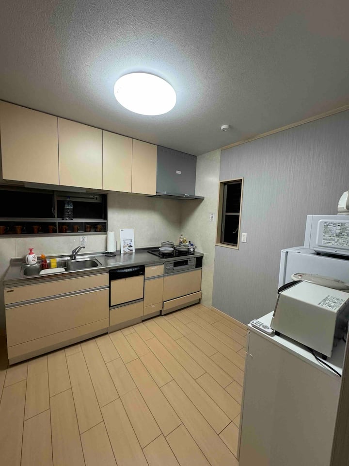 這間是在天神橋筋旁邊,因為想要參加天神祭,所以選擇的住宿,很新,感覺才剛裝潢好沒多久,所有東西都很新,洗衣機是洗脫烘,有三間房間,兩間塌塌米,一間西式房間,塌塌米味道很香,很舒服,一樓洗手台也有兩座,二樓也有一個洗手台,位置超級方便,只要走2分鐘就到天神橋筋,方便買東西、吃東西,還有一間錢湯,可以體驗日本錢湯的感覺,不過價格就比較高,一晚大約要5500元,唯一缺點就是上三樓的樓梯很陡,但二樓也有一間雙人房,所以不適合走的人就可以住二樓。